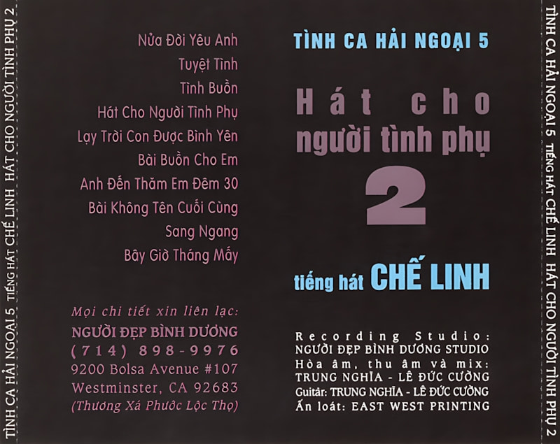 Album Tình Ca Hải Ngoại 5: Hát Cho Người Tình Phụ 2 do Người Đẹp Bình Dương phát hành năm 1992 là tuyển chọn những ca khúc trữ tình đầy cảm xúc qua tiếng hát của Chế Linh. Album mang đến không khí buồn nhẹ, nhớ nhung qua các bài như Tuyệt Tình, Bài Buồn Cho Em hay Bây Giờ Tháng Mấy, phù hợp với những ai yêu nhạc vàng hải ngoại và những tâm trạng hoài cổ.