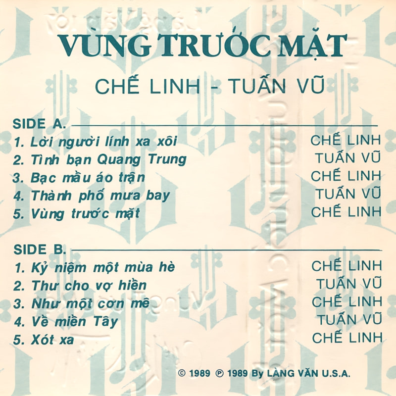 Album “Vùng Trước Mặt” (1989) do Làng Văn phát hành là sự kết hợp hiếm có giữa hai giọng ca lừng danh Chế Linh và Tuấn Vũ. Tuyển tập gồm những ca khúc mang đậm âm hưởng lính chiến và tâm sự của người xa xứ, với nỗi nhớ, tình bạn, và những ký ức chiến trường. Hai giọng hát khàn trầm và da diết tạo nên không khí bi tráng nhưng vẫn đầy cảm xúc của dòng nhạc vàng.