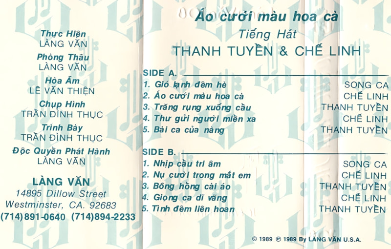 Album “Áo Cưới Màu Hoa Cà” (1989) do Làng Văn phát hành, quy tụ hai giọng ca huyền thoại Thanh Tuyền và Chế Linh. Với 10 ca khúc trữ tình sâu lắng, album khắc họa hình ảnh người tình xa xứ, những cuộc chia ly và nỗi nhớ khôn nguôi. Giai điệu mộc mạc cùng chất giọng khàn ấm của Chế Linh và nét ngân nga đặc trưng của Thanh Tuyền tạo nên một tuyệt phẩm nhạc vàng khó quên.
