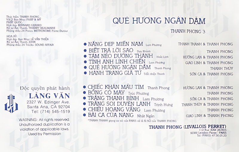Album “Quê Hương Ngàn Dặm” (Làng Văn 53) là một tuyển tập nhạc quê hương, lính và tình cảm, với sự góp mặt của nhiều ca sĩ nổi tiếng như Thanh Thanh, Hương Lan, Giao Linh, Sơn Ca và Thanh Thúy. Các ca khúc trong băng nhạc mang đậm chất trữ tình quê hương, ca ngợi tình yêu đất nước, tình lính và nỗi nhớ về nguồn cội. Đây là một trong những sản phẩm nổi bật của Thanh Phong, góp phần giữ gìn và lan tỏa dòng nhạc vàng đến công chúng hải ngoại.