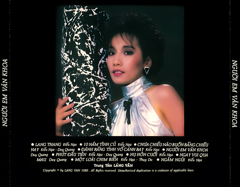 Album Người Em Văn Khoa (Làng Văn CD 008) đánh dấu thời kỳ đầu của dòng nhạc tình tự quê hương được trung tâm Làng Văn phát hành. Với chất giọng trong sáng của Kiều Nga và sự sâu lắng của Duy Quang, album mang đến không gian trữ tình, man mác nỗi nhớ về tình yêu và tuổi trẻ. Các bản song ca được phối khí mộc mạc, đậm chất thập niên 80.